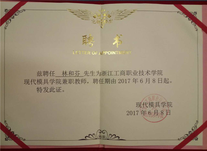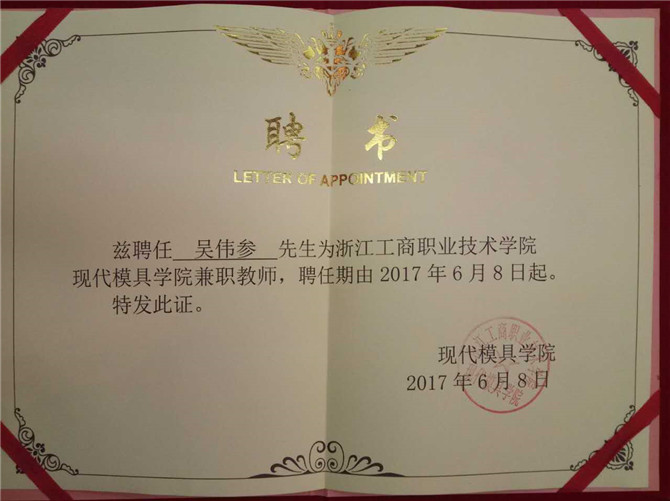 Huabao company since 2010, with industrial and commercial vocational technology college of zhejiang university-enterprise cooperation, warburg tooling department emerged a large number of qualified part-time teachers of senior cadres, they were industrial and commercial college employment as part-time teachers. On June 8, 2017, huabao shares four comrades were employed as a modern zhejiang ninghai branch of industry and commerce professional technology institute mould part-time teachers, they are respectively and Mr Lin, Lu Yunxiang, Lin Changhong, Wu Weican.