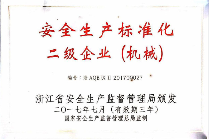In zhejiang province on July 27, 2017, the supervision and administration of production safety list released 71 secondary standard enterprise safety production standardization, huabao company through the national supervision and administration of production safety standardization level 2 enterprise comprehensive evaluation standard, conform to the requirements of the safety production standardization level 2 enterprise standard, voted for free replacement safety production standardization enterprise. The only four enterprises conform to the standards for renewal of the free trial, huabao company can become one of the enterprises, is the result of all the staff work together to create.