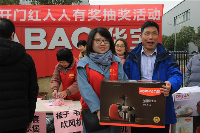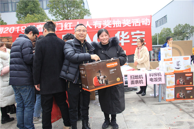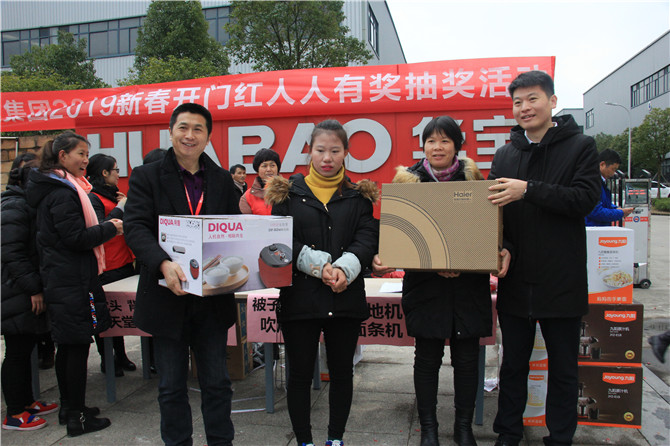 華寶公司為了迎接和感謝2018年的辛勤付出及時(shí)返崗的員工,在董事長胡仁寶先生的親自帶領(lǐng)下,公司為員工精心準(zhǔn)備了豐厚的獎(jiǎng)品:大到面條機(jī)、掃地機(jī)、電飯煲,小到被子、毛毯、背包、四件套、開水煲、電吹風(fēng)、雨傘等等只要到場便人人有獎(jiǎng)。